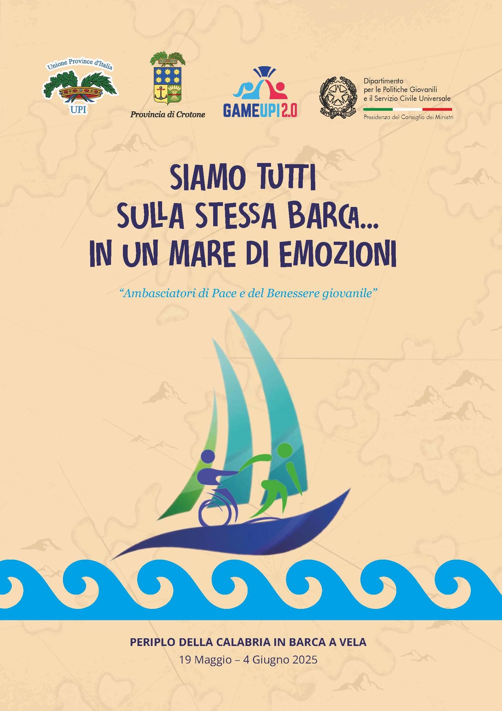 "SIAMO TUTTI SULLA STESSA BARCA...in un mare di emozioni". E' un’iniziativa realizzata nell’ambito del progetto denominato “Fare Squadra 2.0” della Provincia di Crotone, finanziato dall’Unione delle Province d’Italia e dal dipartimento per le Politiche Giovanili e il Servizio Civile Universale della Presidenza del Consiglio dei Ministri, nel quadro del Programma G.A.M.E. 2.0 (G.iovani A.utodeterminazione M.ovimento E.mpowewrement) - Fondo Politiche Giovanili annualità 2023.